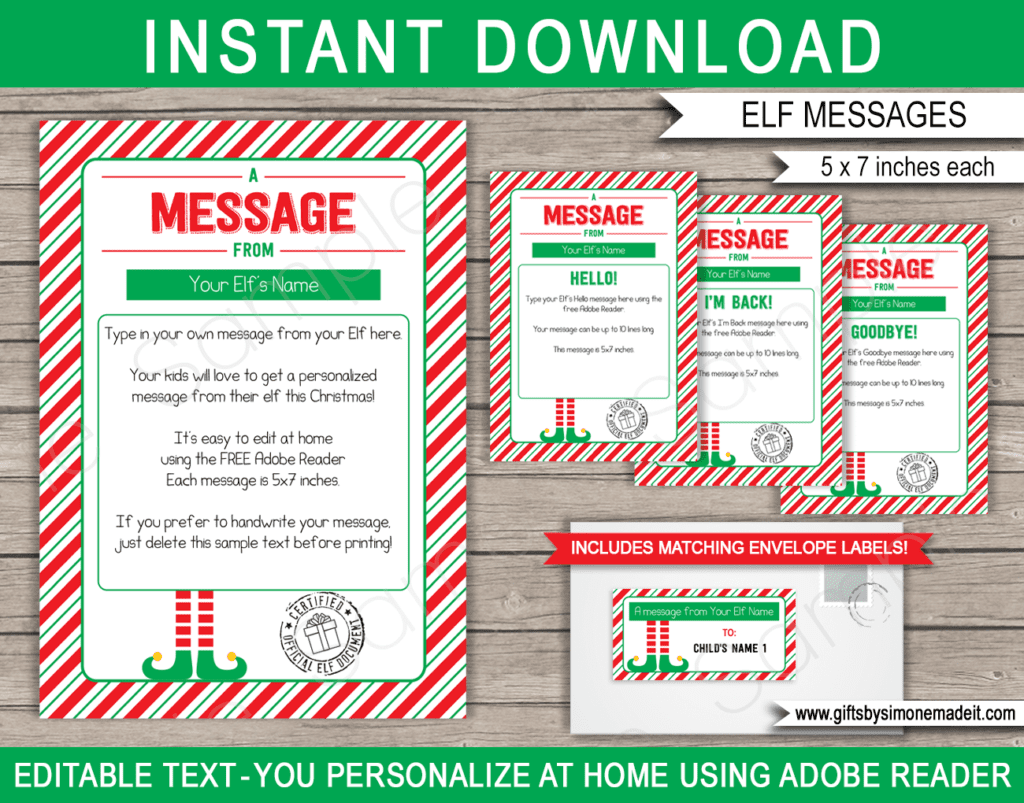 When your Elf needs to say “Hello,” “I’m Back,” or “Goodbye,” or just has something to say, these ready-to-go messages will save you at 10pm! Personalize the notes with your Elf’s name, add a child’s name to the matching labels, and you’ve got instant elf mail that looks straight out of the North Pole post room.